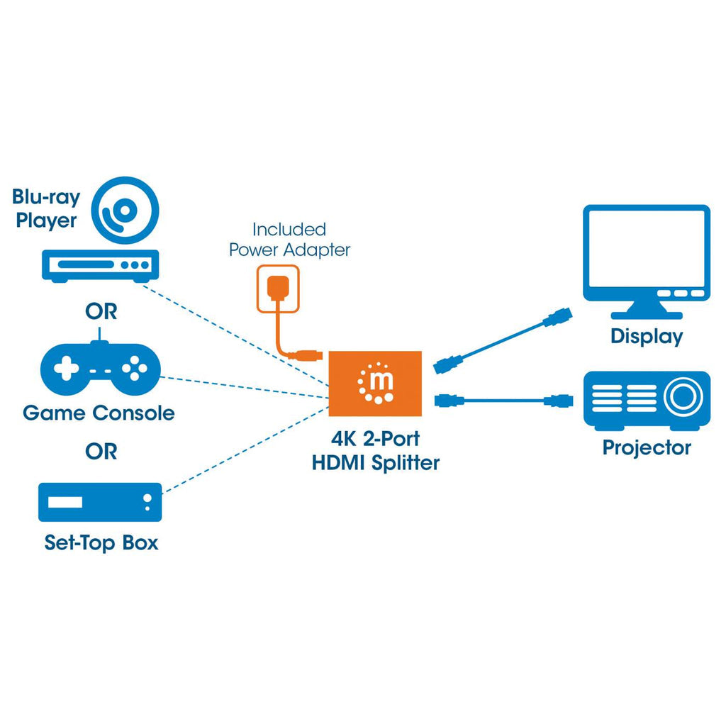 Manhattan 207669. Video porttyp: HDMI, Video UT: 2x HDMI. Maximal upplösning: 3840 x 2160 pixlar, Produktens färg: Svart, Material, hölje: Plast. Utgångsspänning: 5 V, Uteffekt: 1 A. Bredd: 49 mm, Djup: 75 mm, Höjd: 16 mm