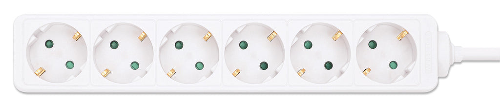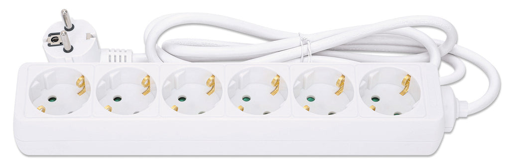 Manhattan 168304. Kabellängd: 2 m, Placeringar som kan användas: inomhus, AC försäljningsställen: Typ F. Antal uttag AC: 6 AC-utgångar. AC-inspänning: 220 - 250 V, Växelström Frekvens: 50-60 hz, Max. ineffekt: 3680 W. Bredd: 50 mm, Djup: 274 mm, Höjd: 42 mm. Antal produkter som medföljer: 1 styck, Vikt inkl. förpackning: 420 g
