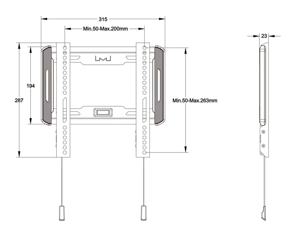 Multibrackets 5631. Maxvikt: 50 kg, Minsta skärmstorlek: 61 cm (24"), Maximal skärmstorlek: 139,7 cm (55"), Monteringsgränssnitt kompatibilitet (min): 50 x 50 mm, Monteringsgränssnitt kompatibilitet (max): 200 x 200 mm. Avstånd till väggen (max): 2,3 cm. Produktens färg: Svart