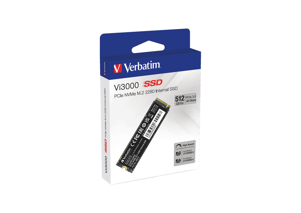 Verbatim Vi3000. Solid-state drive kapacitet: 512 GB, SSD-diskens formfaktor: M.2, Läshastighet: 3100 MB/s, Skrivhastighet: 2100 MB/s, Komponent för: PC / bärbar dator